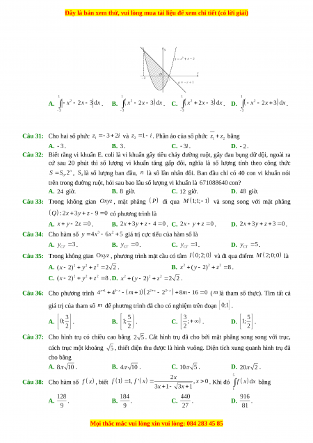 và song song với mặt phẳng có phương trình là A. . B. . C. . D. . Câu 34: Cho hàm số
