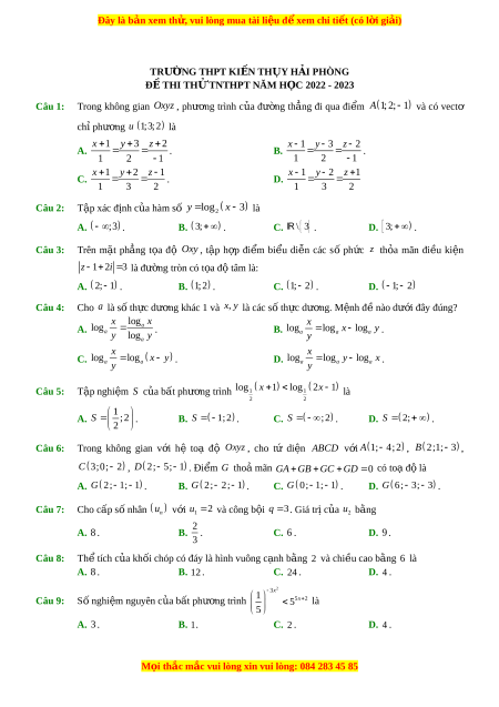 Đây là bản xem th , vu ử i lòng mua tài li u ệ đ xe ể m chi ti t ế (có l i ờ gi i ả ) TRƯỜNG THPT KI N Ế TH Y Ụ H I Ả PHÒNG Đ Ề THI TH Ử TNTHPT NĂM H C Ọ 2022 - 2023 Câu 1: