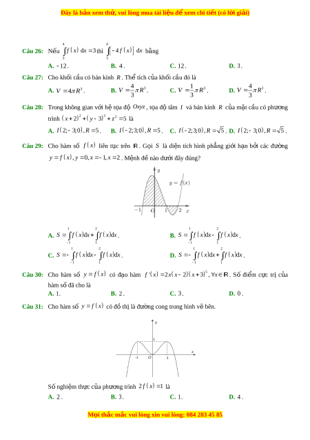 thì 4 f x dx bằng 3 3 A. 12 . B. 4 . C. 12 . D. 3 . Câu 27: Cho kh i