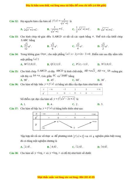 Câu 32: H nguyên hàm c a hàm s ọ ủ ố