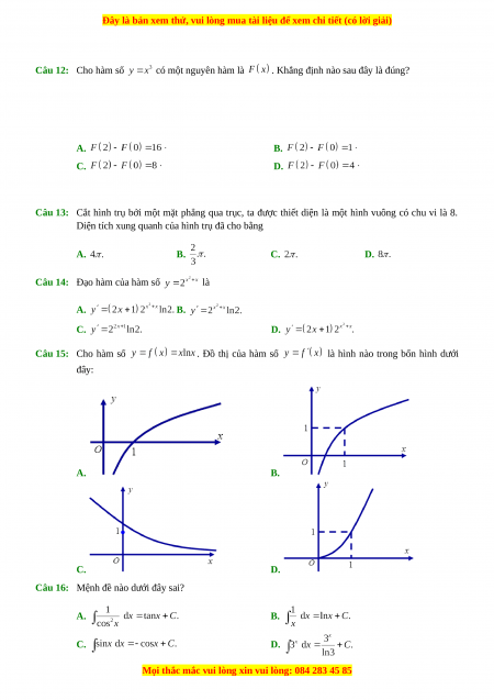 Câu 12: Cho hàm số có một nguyên hàm là . Khẳng định nào sau đây là đúng?