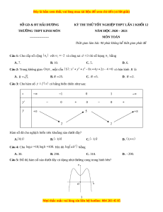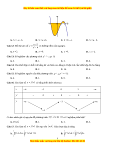 A. S a . b B. S a . b C. S b . a D. S a . b x 2 Câu 12: Đ t ồ hị hàm s ố y có đư ng t ờ i m ệ cận ngang là 2 x 4 A. y 2 . B. y 0 . C. y 1 . D. x 2. Câu 13: S nghi ố ệm c a ủ phư ng ơ trình 2x 2 3 x 2 7 là A. 3. B. 1. C. 2. D. 0. Câu 14: Cho kh i ố h p c ộ ó th t ể ích b ng 64 và ằ chi u c ề ao bằng 4. Di n t ệ ích c a ủ kh i ố h p đã ộ cho b ng ằ A. 8. B. 2. C. 16. D. 6. Câu 15: S nghi ố ệm nguyên c a ủ bất phư ng ơ trình 2 x 1 x 3x2 4 2 là A. 4. B. 1. C. 0. D. 3. Câu 16: Cho hàm s