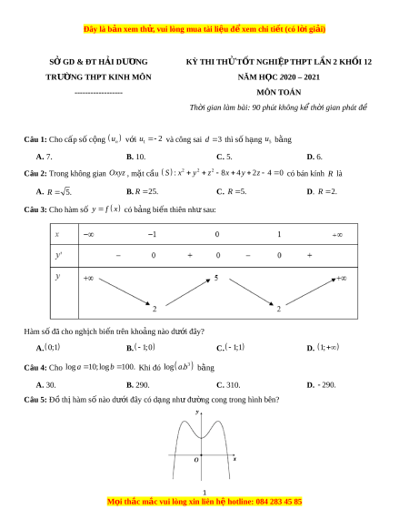 Đề thi thử Toán trường Kinh Môn năm 2021
