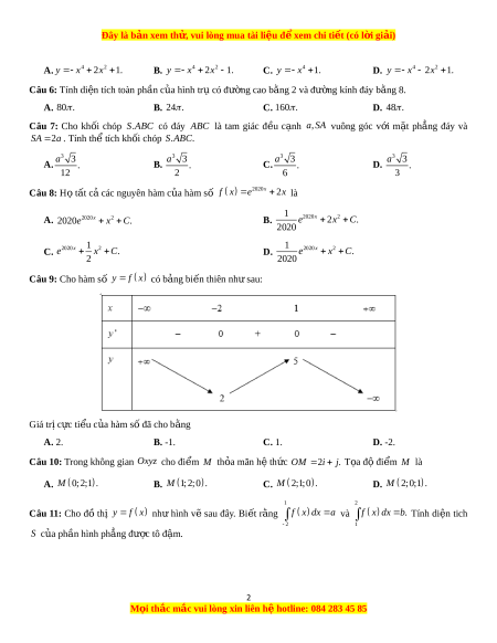 ọ ất cả các nguyên hàm c a ủ hàm s ố 2020x f x e 2x là 1 A. 2020 x 2 2020e x x C. B. 2020 2 e 2x C. 2020 1 x 1 C. 2020 2 x e x C. D. 2020 2 e x C. 2 2020 Câu 9: Cho hàm s