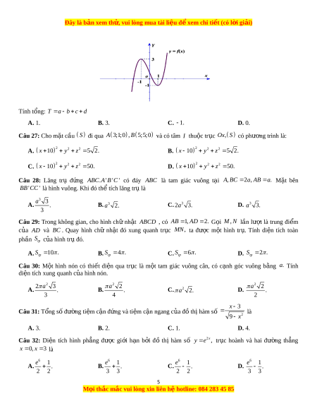 Câu 4: Cho log a 1 0; log b 1 00. Khi đó 3 log . a b bằng A. 30. B. 290. C. 310. D. 290. Câu 5: Đ t ồ hị hàm s nà ố o dư i