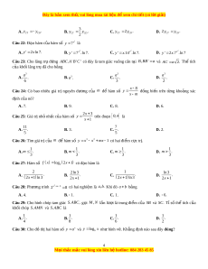 ố y x x 3 2 là: A. \ 0 ;1 . B. 0; 1 . C. \ 0 . D. ; 0 1; . Câu 10: Đ t ồ hị hàm s nà ố o sau đây có đư ng t ờ i m ệ cận ngang? x 1 2 x 2x A. y . B. 3 y x 3 . x C. y . D. y . 2 x x 1