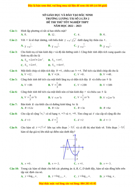 Đề thi thử Toán trường Lương Tài 2 - Bắc Ninh lần 2 năm 2023