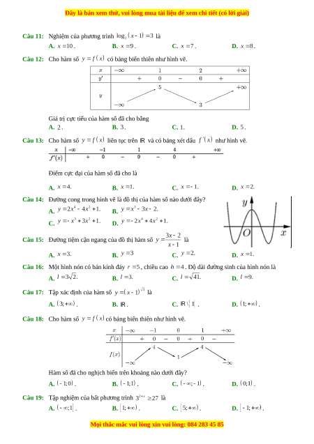 Câu 11: Nghiệm của phương trình là A. . B. . C. . D. . Câu 12: Cho hàm số