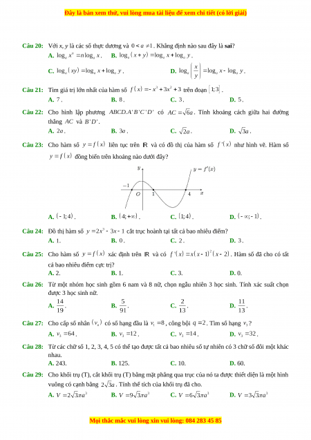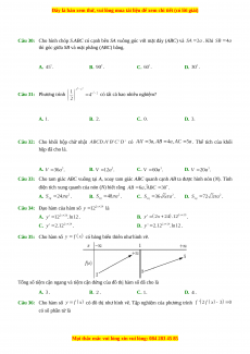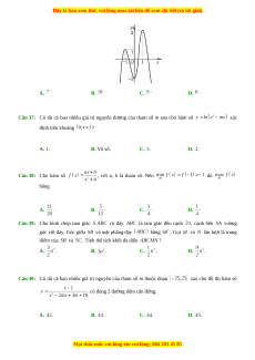 Câu 34: Đạo hàm của hàm số là A. . B. . C. . D. . Câu 35: Cho hàm số