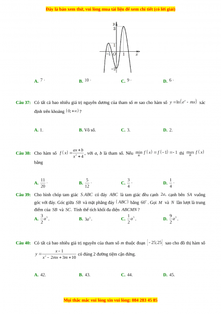 Câu 40: Có tất cả bao nhiêu giá trị nguyên của tham số m thuộc đoạn sao cho đồ thị hàm số