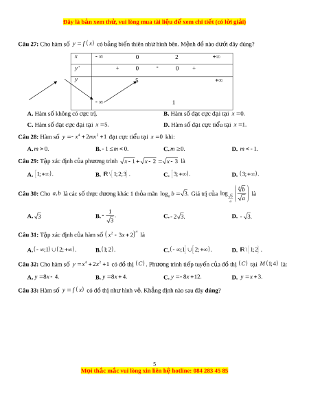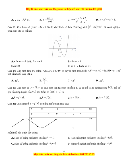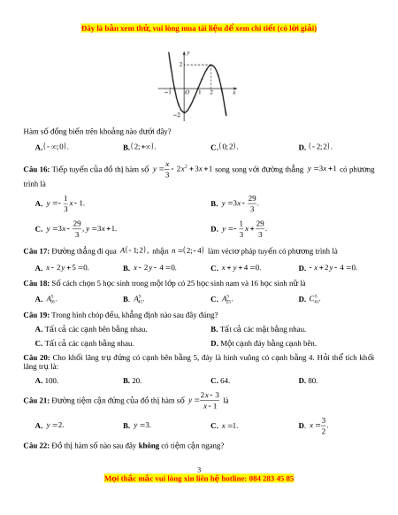 Đây là bản xem th , vu ử i lòng mua tài li u ệ đ xe ể m chi ti t ế (có l i ờ gi i ả ) Hàm s đ ố ng bi ồ n t ế rên khoảng nào dư i ớ đây? A. ; 0 . B. 2; . C. 0; 2 . D. 2; 2 . x Câu 16: Ti p ế tuy n ế c a ủ đồ thị hàm số 2
