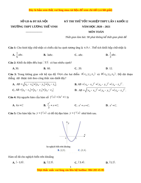 SỞ GD & ĐT HÀ N I Ộ KỲ THI TH Ử T T Ố NGHI P Ệ THPT L N Ầ 1 KH I Ố 12 TRƯ N Ờ G THPT LƯ N Ơ G TH Ế VINH NĂM H C