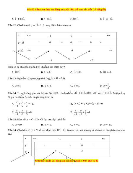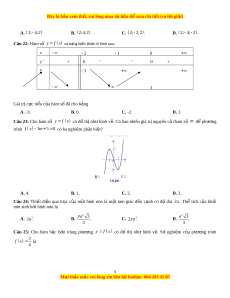 g ' x 0 + 0 0 + g x 0 2 2 Hàm s đã ố cho đ ng ồ bi n t ế rên kho ng nà ả o dư i ớ đây? A. 0; 1 . B. 2;0 . C. 1;0 . D. 0; . Câu 13: Nghiệm c a ủ phư ng t ơ rình log x 4 2 3 là 1 A. x 4 . B. x 1 3. C. x 9 . D. x . 2