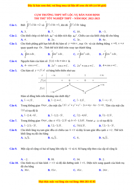 Đề thi thử Toán trường Mỹ Lộc - Vụ Bản - Nam Định năm 2023