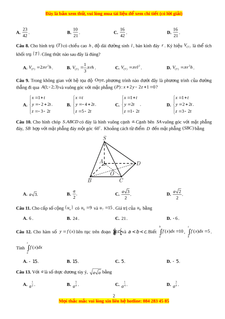ộ góc 60 . Khoảng cách từ điểm D đến mặt phẳng (SBC) bằng a a 3 a 2 A. a 3. B. . C. . D. . 2 2 2 Câu 11. Cho cấp s c ố ng ộ u u 9 u 1 5 u n có 6 và 7 . Giá trị c a ủ 8 bằng A. 6 . B. 24 . C. 21. D. 6 . b c