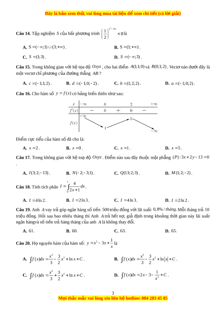Đây là bản xem th , vu ử i lòng mua tài li u ệ đ xe ể m chi ti t ế (có l i ờ gi i ả ) 2 x 4x 1 Câu 14. Tâp nghi m ê S c a ủ bất phư ng ơ trình 8 là 2 A. S ( ; 1) (3; ) . B. S ( 1; ) . C. S ( 1;3) . D. S ( ; 3) .