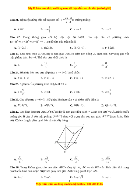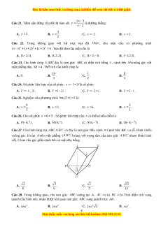 C. z 2 i . D. z 2 i . Câu 25. Nghi m ê c a ủ phư ng ơ trình log (2x) 2 3 là: 9 5 A. x . B. x 3 . C. x 6 . D. x . 2 2 Câu 26. Cho s ph ố c ư z 6 7i . S ph ố c ư liên h p ơ c a ủ z có đi m ể bi u di ể n l ễ à: A. P( 6;7) . B. M (6;7) .