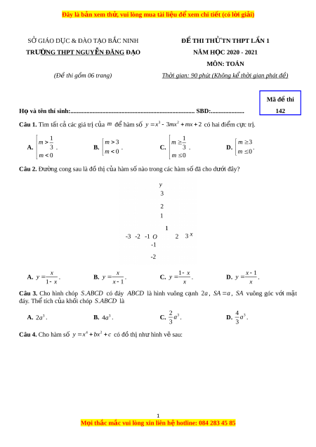 Đây là bản xem th , vu ử i lòng mua tài li u ệ đ xe ể m chi ti t ế (có l i ờ gi i ả ) S G Ở IÁO D C & Ụ ĐÀO T O Ạ B C N Ắ INH Đ Ề THI TH Ử TN THPT L N Ầ 1 TRƯỜNG THPT NGUY N Ễ ĐĂNG Đ O Ạ NĂM H C Ọ 2020 - 2021 MÔN: TOÁN (Đề thi g m ồ 06 trang) Th i