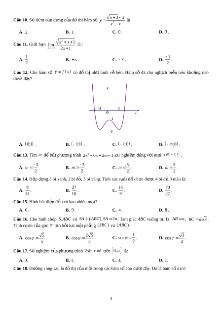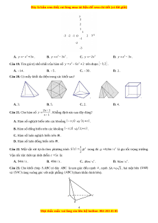 ở hai mặt phẳng (SBC) và (ABC). 5 2 5 1 3 A. cos . B. cos . C. cos . D. cos . 5 5 2 2 Câu 17. S nghi ố ệm c a ủ phư ng ơ trình 2sin x 1 trên 0, là: A. 0. B. 1. C. 3. D. 2. Câu 18. Đư ng c ờ ong sau là đ t ồ hị c a ủ m t ộ trong các hàm s c ố ho dư i ớ đây. Đó là hàm s nà ố o? 3