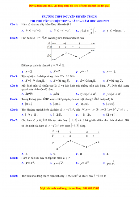 Đề thi thử Toán trường Nguyễn Khuyến - HCM lần 1 năm 2023