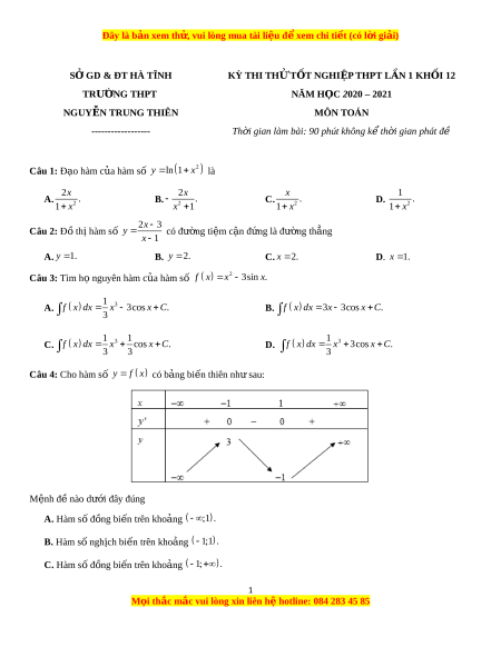 Đề thi thử Toán trường Nguyễn Trung Thiên năm 2021