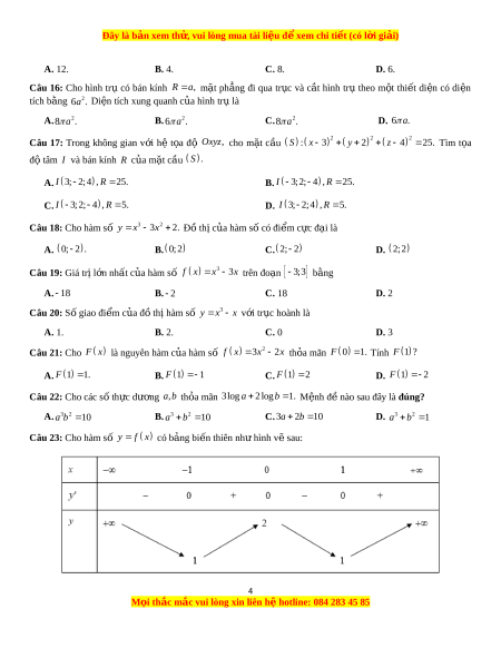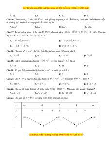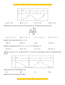 Câu 14: Cho hàm số f x xác đ nh ị trên \ 0 , liên t c ụ trên m i ỗ kho ng ả xác đ nh ị và có b ng ả bi n ế thiên như sau Hàm s đã ố cho có bao nhiêu đi m ể c c ự tr ? ị A. 3. B. 0. C. 1. D. 2. Câu 15: S c ố ạnh c a ủ m t ộ hình t di ứ n ệ là 3 M i