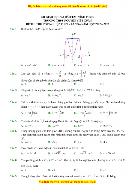 Đề thi thử Toán trường Nguyễn Viết Xuân - Vĩnh Phúc lần 3 năm 2023