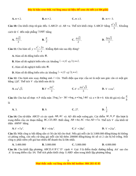 Đây là bản xem th , vu ử i lòng mua tài li u ệ đ xe ể m chi ti t ế (có l i ờ gi i ả ) A. m 2. B. m 2. C. m 3 . D. m 3. 3 a 2 Câu 10: Cho kh i ố chóp t ứ giác đ u