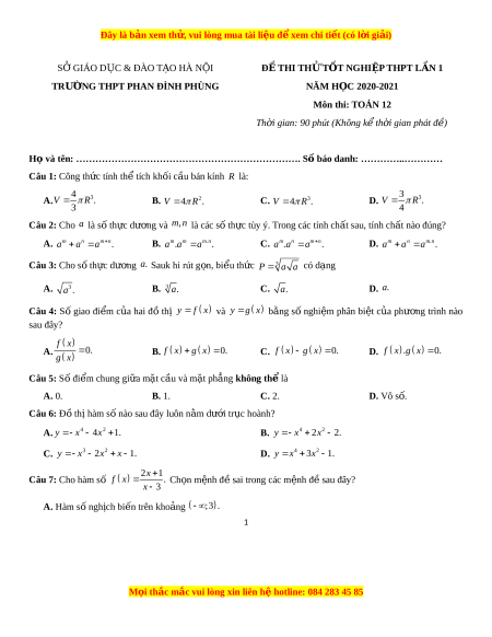 Ờ G THPT PHAN ĐÌNH PHÙNG NĂM H C Ọ 2020-2021 Môn thi: TOÁN 12 Th i