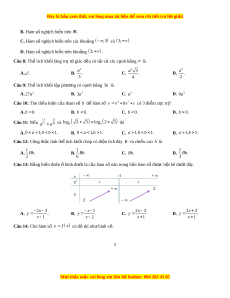 y x bx c có 3 đi m ể c c ự tr ? ị A.b 0 . B. b 0 . C. b 0. D. b 0. 13 15 Câu 11: Nếu log 2 5 log 2 3 17 18 a và b b thì a