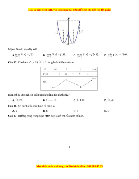 ố y f x có bảng biến thiên nh s ư au Hàm s đã ố cho ngh c ị h bi n t ế rên kho ng nà ả o dư i ớ đây? A. 0; 2 . B. ; 1 . C. 1; 1 . D. 0; 4 . Câu 16: S c ố ạnh c a ủ m t ộ hình t di ứ n ệ là A. 9 B. 8 C. 4 D. 6 Câu 17: Đư ng c ờ ong trong hình dư i ớ đây là đ t ồ hị c a ủ hàm s nà ố o? 3 M i