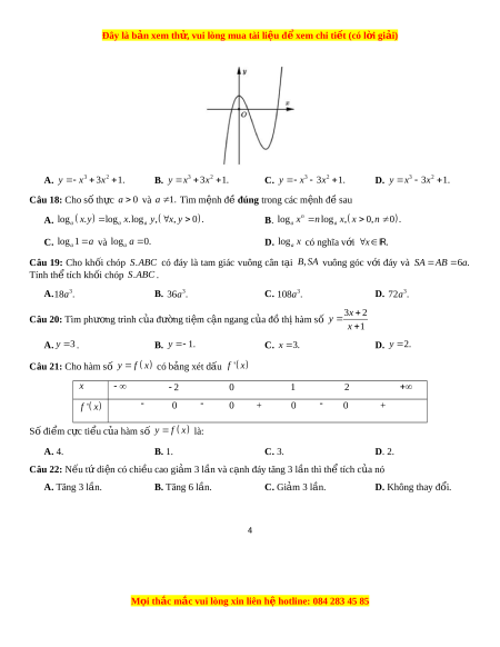 ố chóp S.ABC . A. 3 18a . B. 3 36a . C. 3 108a . D. 3 72a . 3x 2 Câu 20: Tìm phư ng t ơ rình c a ủ đư ng t ờ i m ệ c n nga ậ ng c a ủ đ t ồ h hà ị m s ố y x1 A. y 3 . B. y 1. C. x 3 . D. y 2 . Câu 21: Cho hàm s