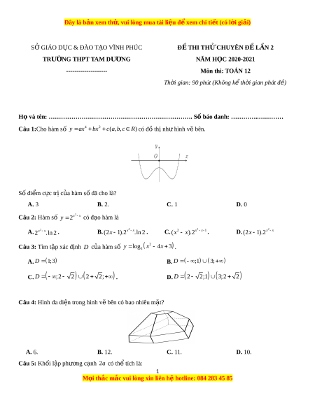 Đây là bản xem th , vu ử i lòng mua tài li u ệ đ xe ể m chi ti t ế (có l i ờ gi i ả ) S G Ở IÁO D C & Ụ ĐÀO T O Ạ VĨNH PHÚC Đ Ề THI TH C Ử HUYÊN Đ L Ề N Ầ 2 TRƯ N Ờ G THPT TAM DƯ N Ơ G NĂM H C Ọ 2020-2021 -------------------- Môn thi: TOÁN 12 Th i