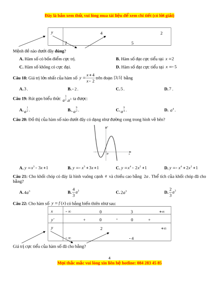 Đây là bản xem th , vu ử i lòng mua tài li u ệ đ xe ể m chi ti t ế (có l i ờ gi i ả ) y 4 2 2 5 M nh đ ệ ề nào dư i ớ đây đúng? A. Hàm s c ố ó b n ố đi m ể c c ự tr .ị B. Hàm s đ ố ạt c c ự ti u ể t i ạ x 2 C. Hàm s không c ố ó c c ự đại. D. Hàm s đ ố ạt c c ự ti u t ể ại x 5 x 4
