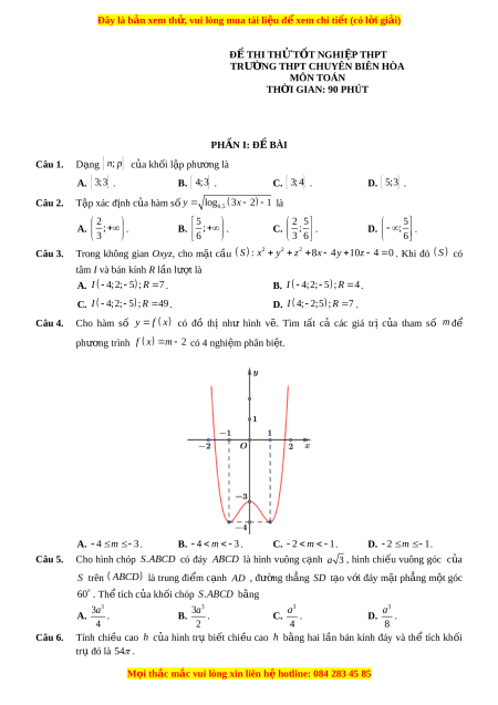 Ờ G THPT CHUYÊN BIÊN HÒA MÔN TOÁN TH I Ờ GIAN: 90 PHÚT PH N Ầ I: Đ BÀ Ề I Câu 1. Dạng ; n p c a ủ kh i ố l p ph ậ ư ng l ơ à A. 3; 3 . B. 4; 3 . C. 3; 4 . D. 5; 3 . Câu 2. Tập xác đ nh c ị a ủ hàm số y log 3x 2 1 là 0,5 2 5 2 5 5 A. ; . B. ; . C. ; . D. ; . 3 6 3 6 6 Câu 3.