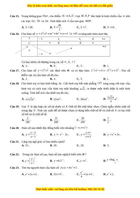 ụ Ox , Oy và Oz . Tính di n ệ tích S c a ủ tam giác MNP . 49 A. S 2 8 . B. S . C. S 7 . D. S 1 4 . 2 Câu 16. Cho hàm s
