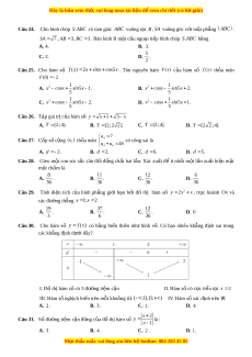 trong tập S . Tính xác su t ấ để số đư c ợ ch n ọ có đúng b n ố ch ữ s ố lẻ và ch ữ số 0 có hai chữ s k ố ề nó là ch s ữ l ố ẻ. 2 21 20 1 A. . B. . C. . D. . 189 200 189 2 Câu 20. Hàm s nà ố o dư i ớ đây đ ng bi ồ n ế trên kho ng ả ; ? x 2 x 1 A. y . B. 3