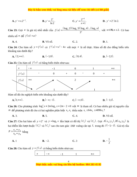 Đây là bản xem th , vu ử i lòng mua tài li u ệ đ xe ể m chi ti t ế (có l i ờ gi i ả ) 2x x 1 2 A. x 1 y ' . x 2 . B. y ' . C. y ' . D. ' 2 . x y ln 2. ln 2 x 1