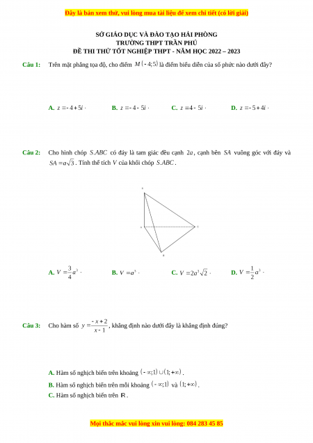 Đề thi thử Toán trường Trần Phú - Hải Phòng năm 2023