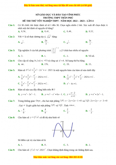 Đề thi thử Toán trường Trần Phú - Vĩnh Phúc lần 4 năm 2023