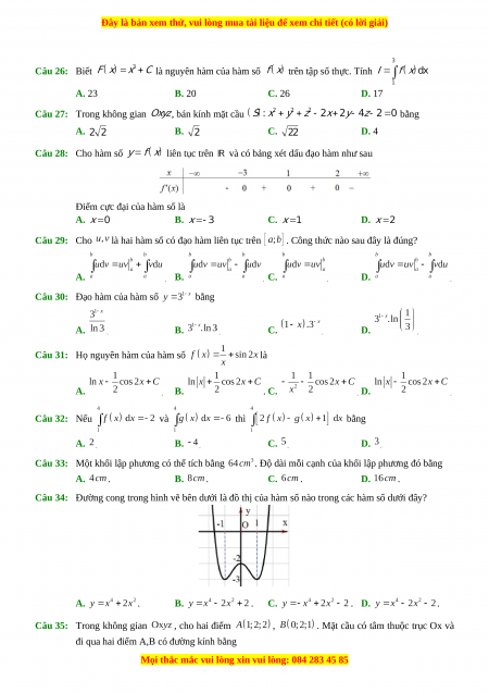 Câu 31: Họ nguyên hàm của hàm số là A. . B. . C. . D. . Câu 32: Nếu và thì bằng A. . B. . C. . D. .