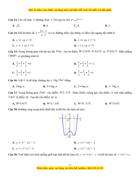 Đây là bản xem th , vu ử i lòng mua tài li u ệ đ xe ể m chi ti t ế (có l i ờ gi i ả ) Câu 13: Cho s t ố h c ự a dư ng, khá ơ c 1. Tìm giá trị c a ủ log 8 a a P a A. 2. B. 4. C. 8. D. 2. 2x 3 Câu 14: Đ t ồ hị hàm s ố y có các đư ng ờ ti m ệ cận đ ng và ứ ti m ệ cận ngang lần lư t ợ là x 1 A. x 1 và y 2 . B. x 1