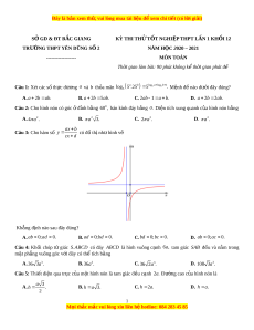 Câu 2: Cho hình nón có góc đ ở nh b ỉ ằng 0 60 , bán kính đáy bằng . a Di n t ệ ích xung quanh c a ủ hình nón b ng ằ A. 2 4 a . B. 2 a 3. C. 2 2 a . D. 2 a . ax b Câu 3: Cho hàm s ố y có đ t ồ hị nh hì ư nh vẽ cx d Khẳng đ nh nà ị o sau đây đúng?