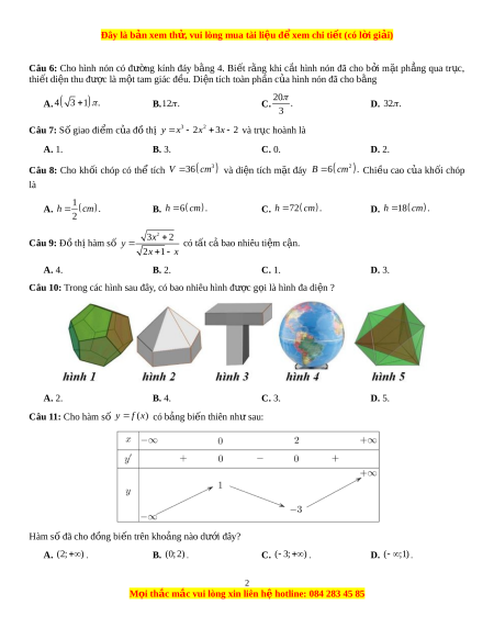 Câu 10: Trong các hình sau đây, có bao nhiêu hình đư c ợ g i ọ là hình đa di n ? ệ A. 2. B. 4. C. 3. D. 5. Câu 11: Cho hàm s