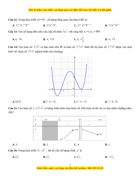Câu 12: Trong khai triển ( )n a b , s h ố ạng t ng ổ quát c a ủ khai tri n ể là.