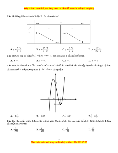 Câu 17: Bảng biến thiên dư i ớ đây là c a ủ hàm s nà ố o? x 3 2x 1 x 1 x 1 A. y . B. y . C. y . D. y . 2 x x 2 x 2 2x 2 Câu 18: Cho cấp s c ố ng ộ u u 4 n 3. n v i ớ n Tìm công sai d c a ủ cấp s c ố ng. ộ A. d 4. B. d 4. C. d 1 . D. d 1.