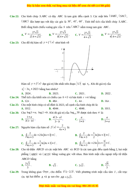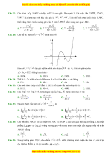 Câu 24: Thể tích c a ủ kh i ố nón có chi u ề cao h 3 và bán kính r 4 bằng: A. 12 . B. 48 . C. 4 . D. 16 . Câu 25: Cho m t ộ hình chóp có s đ ố nh ỉ là 2023, s c ố ạnh c a ủ hình chóp đó là: A. 1012 . B. 4044 . C. 4046 . D. 1011.