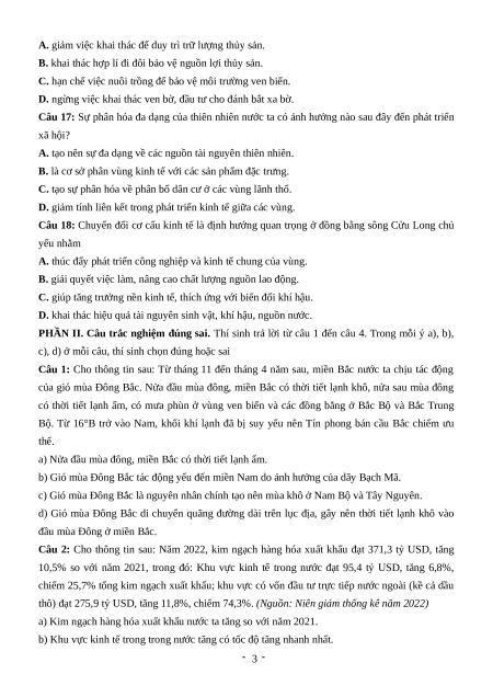 Câu 17: Sự phân hóa đa dạng của thiên nhiên nước ta có ảnh hưởng nào sau đây đến phát triển xã hội?