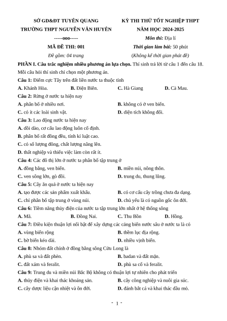 Đề thi thử tốt nghiệp 2025 Địa lí THPT Nguyễn Văn Huyên-Tuyên Quang