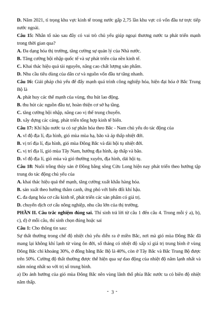 Câu 15: Nhân tố nào sau đây có vai trò chủ yếu giúp ngoại thương nước ta phát triển mạnh trong thời gian qua?